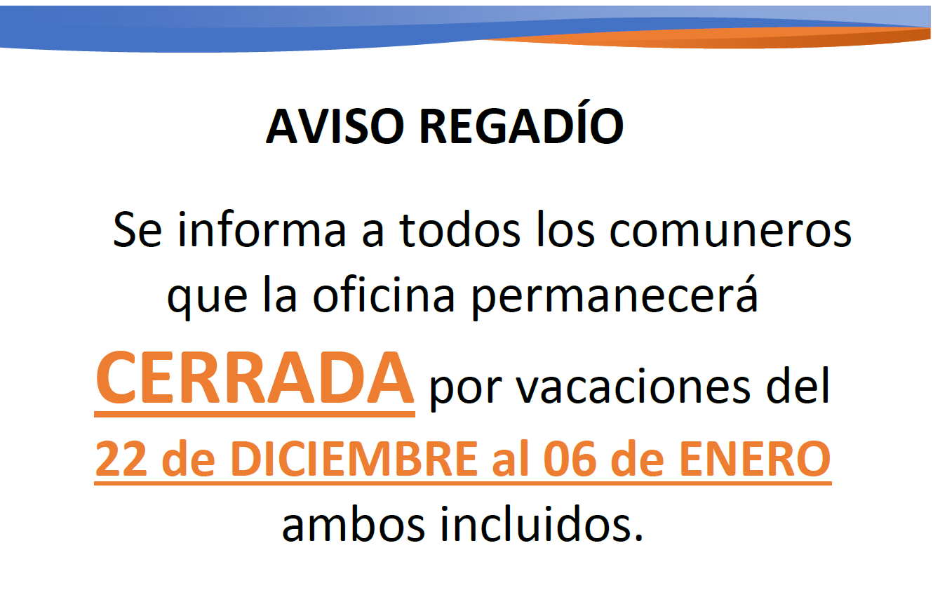 Se informa a todos los comuneros que la oficina permanecerá CERRADA por vacaciones del 22 de Diciembre al 06 de Enero ambos incluidos.